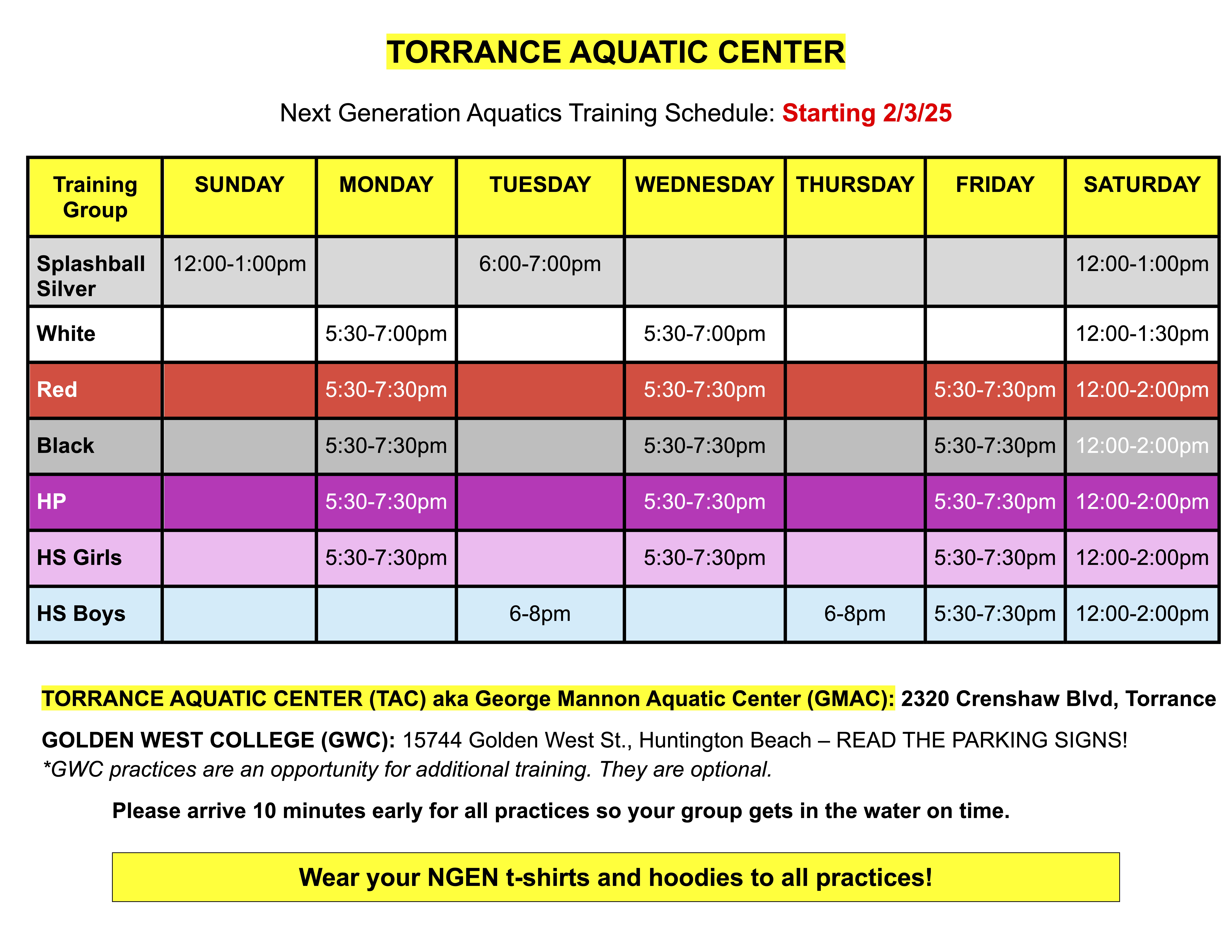 • TORRANCE AQUATIC CENTER PRACTICE SCHEDULE